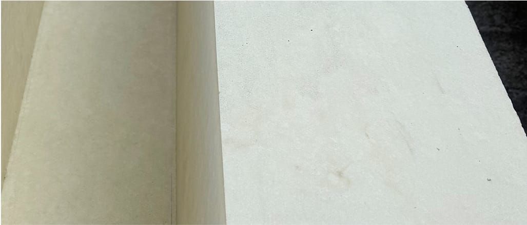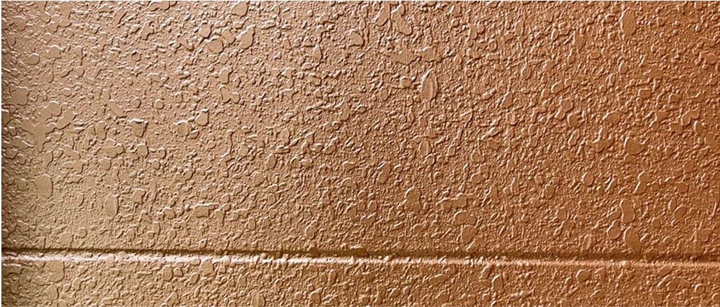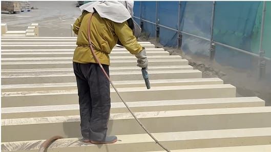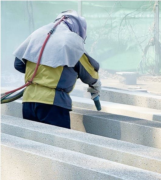 細かい砂や研磨剤をコンプレッサーで圧縮された空気にまぜて高圧噴射し、製品表面に凹凸などの加工をする工法です。当社が主に施工するサンドブラスト工事は、さまざまな形状・色調のコンクリート壁(PC)に凹凸加工する工事です。